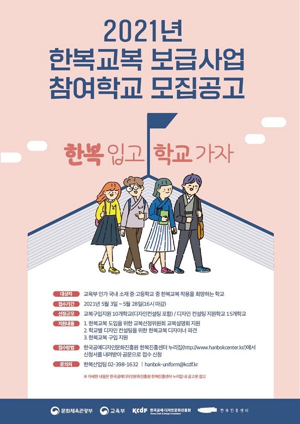 ‘2021 한복 교복 보급 사업’을 통해 지자체·시도교육청 등으로부터 교복비 지원을 받는 학교 중 15개교 내외, 교복비 미지원 학교 중 10개교 내외 등 총 25개교를 선정한다. 참여 학교로 선정된 후에는 학부모, 교사 등이 참여하는 교복선정위원회에서 한복 교복 도입을 확정할 수 있도록 설명회 개최를 지원하며, 교복비 지원을 받는 15개 학교의 경우에는 한복디자이너가 학교 관계자 의견을 수렴해 디자인을 학교 맞춤형으로 개선한 후 교복 시제품 제작을 지원한다.